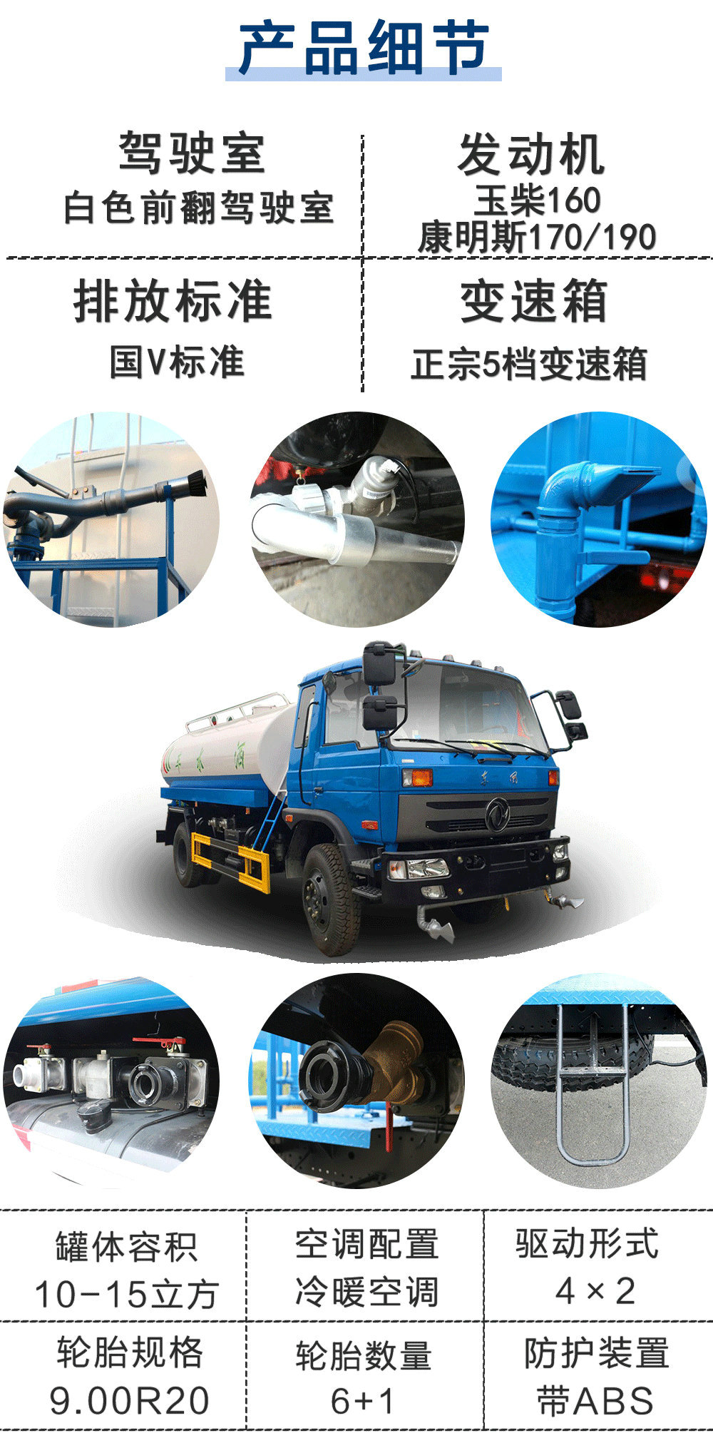 | 其他 | 1.運輸介質(zhì):水,密度:1000千克/立方米,罐體有效容積:9.29立方米;帶后操作平臺時,整車長度/前懸/后懸/離去角/罐體外形尺寸 (長×長軸×短軸)/軸距的對應(yīng)關(guān)系為(mm): 7650,7850/1250,1450/2450/11/4200×2200×1450/3950; 8200,8400/1250,1450/2450/11/4800×2000×1300/4500; 8400,8600/1250,1450/2450/11/4800×2000×1300/4700。 2. 選裝不帶后操作平臺。不帶后操作平臺時,整車長度/前懸/后懸/離去角/罐體外形尺寸 (長×長軸×短軸)/軸距的對應(yīng)關(guān)系為(mm): 6950,7150/1250,1450/1750/13/4200×2200×1250/3950; 7500,7700/1250,1450/1750/13/4800×2000×1300/4500; 7700,7900/1250,1450/1750/13/4800×2000×1300/4700。 3. 當(dāng)選裝后操作平臺時可選裝噴霧機(jī)組。4.側(cè)防護(hù)及后下部防護(hù)裝置均采用Q235A材質(zhì),均采用焊接連接,后下部防護(hù)尺寸:120×50(mm),離地面高度530mm。5.ABS型號為3631010-C2000,生產(chǎn)廠家為東科克諾爾商用車制動系統(tǒng)(十堰)有限公司。6.文字噴圖位置、車輛顏色及局部細(xì)節(jié)可變化。7.隨底盤選裝駕駛室。 | ||