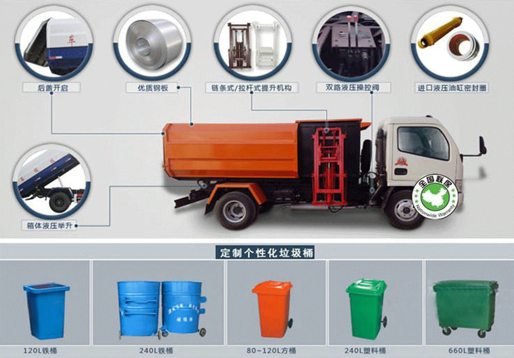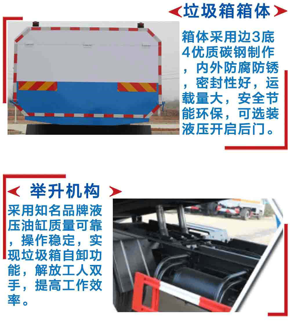 | 其他 | 1、防護(hù)材料:Q235B碳鋼,連接方式:左右側(cè)面防護(hù)與副梁均采用焊接連接,后下部防護(hù)與車架采用焊接連接,后部防護(hù)斷面尺寸(mm):150×50,后部防護(hù)離地高度(mm):390。2、選裝掛鐵桶裝置。3、整車長度/前懸/軸距對應(yīng)關(guān)系為(mm):7890/1440/4500,7700/1250/4500,7340/1440/3950,7150/1250/3950。4、采用的發(fā)動機(jī)型號與油耗值對應(yīng)關(guān)系為(L/100km): ISD180 50(26.8), YC6JA180-50(27.1), ISD190 50(26),ISB210 50(26.5)YC4E160-56(25.8)YC4S150-50(25.7)EQH180-52(26.2)。5、ABS型號為ABS-E 4S/4M,生產(chǎn)企業(yè)是威伯科汽車控制系統(tǒng)(中國)有限公司。6、車輛顏色、文字噴涂及局部細(xì)節(jié)可變化。7、隨底盤選裝駕駛室。8、專用裝置:箱體和掛桶機(jī)構(gòu),主要用于城鎮(zhèn)環(huán)衛(wèi)桶裝生活垃圾的收集與運(yùn)輸。9、可選裝液壓開啟后門外觀。 | ||
