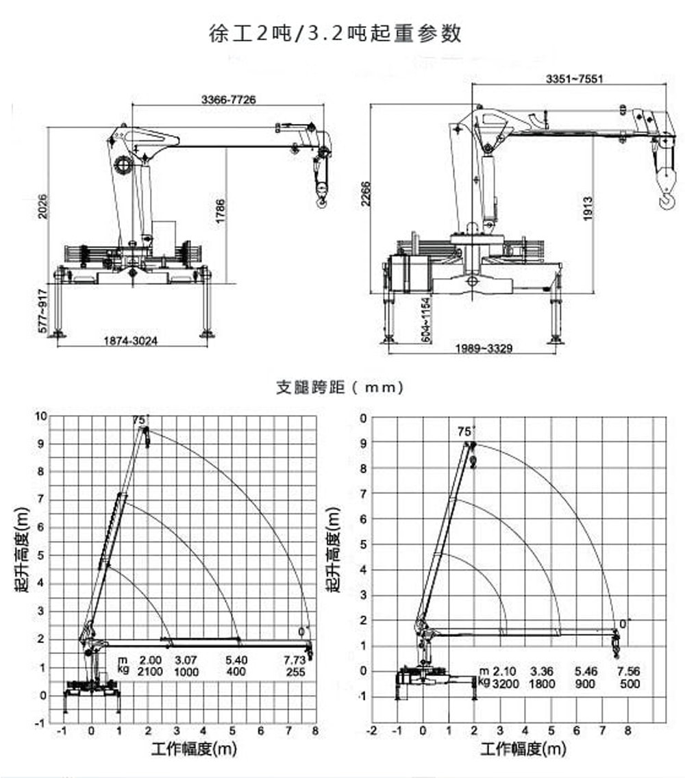 徐工2噸小型隨車吊三節(jié)臂吊臂不伸臂長3.36米,全伸臂長7.73米,水平方向起重參數(shù)為:工作半徑7.73米起重255kg,5.4米起重400kg,3.07米起重1000kg,2米時起重2100kg。