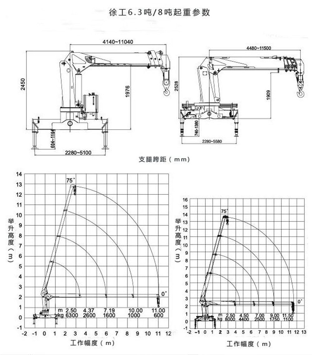 吊臂全伸出長11米,水平起重參數為:11米起吊0.6噸,10米起吊1噸,7.19米起吊1.6噸,4.37米起吊2.6噸,2.5米起吊6.3噸。