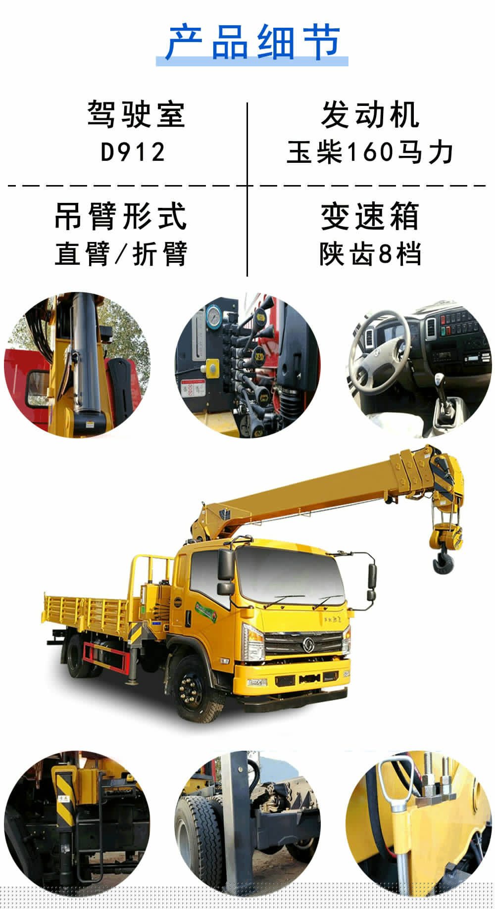 東風特商隨車吊底盤上裝可配5噸,6.3噸,8噸吊機,吊臂節(jié)數,吊臂形式均可選擇,徐工6.3噸四節(jié)臂以上可配高空座椅,圖片中所示KSQS157-4為徐工6.3噸四節(jié)臂吊機,工作半徑11米,舉升高度12.8米。