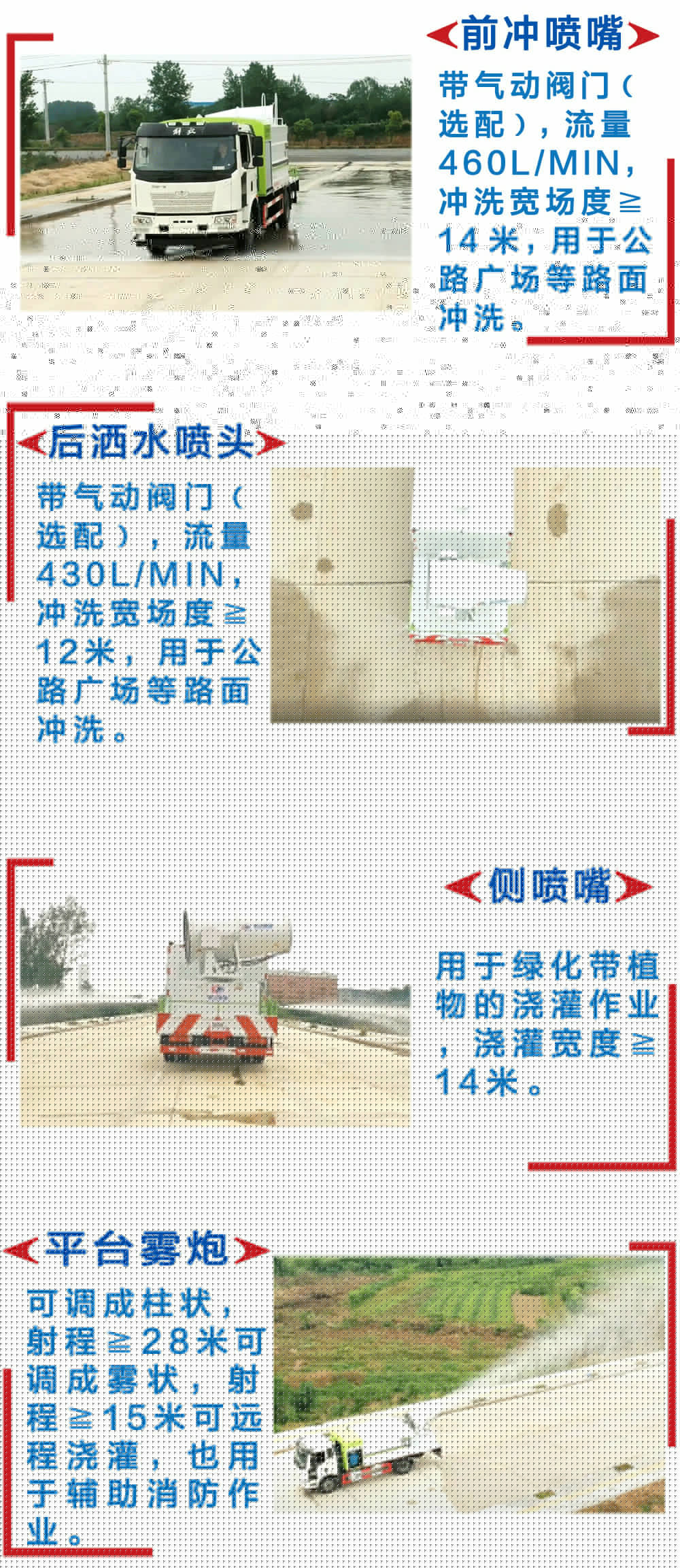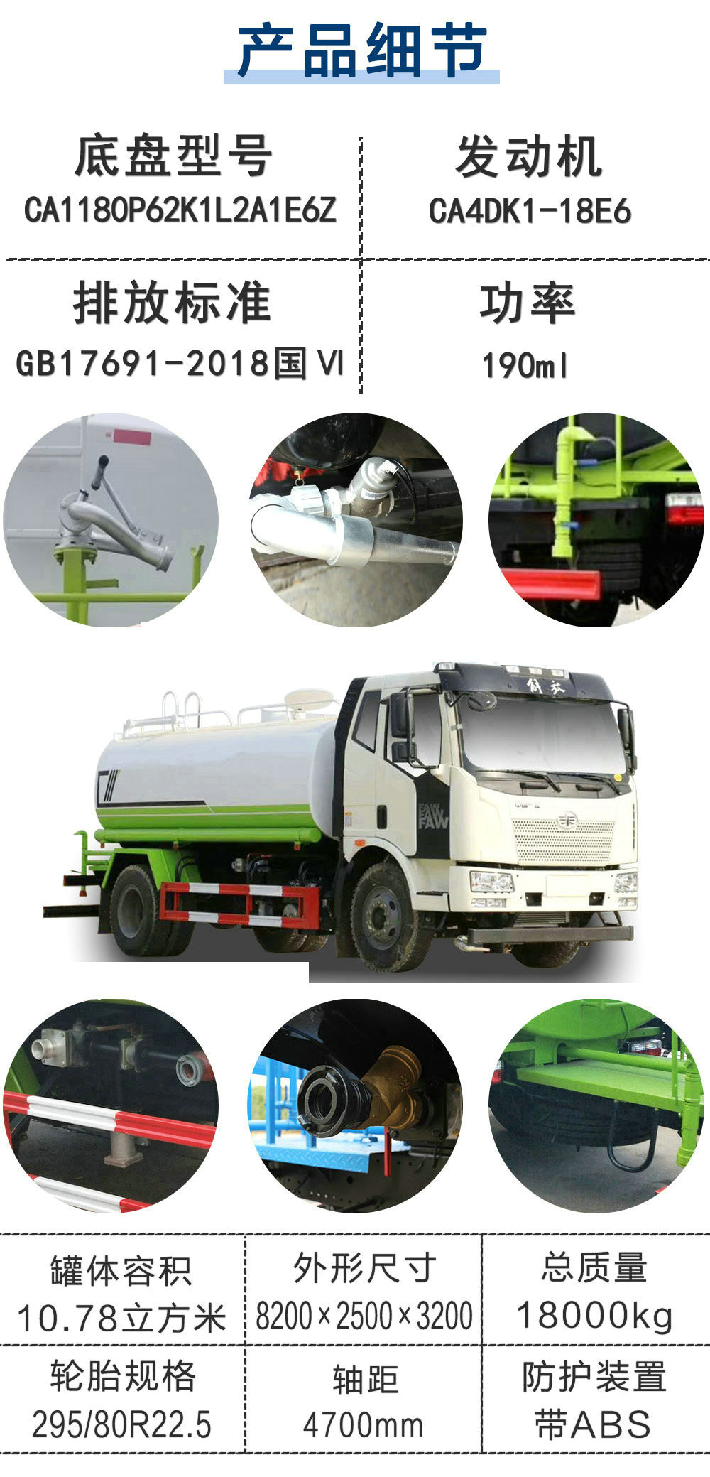| 其他 | 1,該車僅選用4500mm,4700mm軸距,罐體有效容積10.78立方米,罐體外形尺寸(長×長軸×短軸)為(mm):4500×2300×1480;軸距/后懸的對應(yīng)關(guān)系為(mm):4500/2300,4700/2100。2,防護(hù)材料:Q235B碳鋼,連接方式:左右側(cè)面防護(hù)與副梁均采用焊接連接,后下部防護(hù)與車架采用焊接連接,后部防護(hù)斷面尺寸(mm):150×50,后部防護(hù)離地高度(mm):480。3,ABS系統(tǒng)生產(chǎn)廠家:長春瑞立科密汽車電子有限公司,型號:CM4XL。4,隨底盤選裝前圍和燈具、寬體保險杠、腳踏板。5,專用裝置:罐體,主要用于路面灑水及園林綠化。 | ||