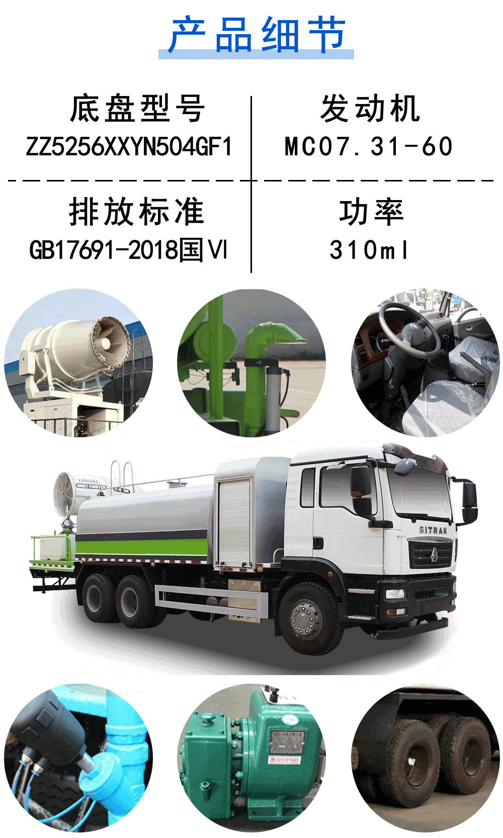 | 其他 | 專用裝置為抑塵霧炮,用于城市抑塵.整車長/軸距/后伸對應(yīng)關(guān)系為(mm):10600/3900+1350/700,10625/3875+1400/700,11000/4300+1350/700,11220/4350+1350/920,11245/4275+1400/920,11520/4600+1350/920,11545/4575+1400/920,11600/4300+1350/1300,11700/5000+1350/700,11725/4975+1400/700.防護(hù)材料:Q235A碳鋼,連接方式:左右側(cè)面及后部防護(hù)均采用焊接連接,后部防護(hù)斷面尺寸(mm):120×50,后部防護(hù)離地高度(mm):500.ABS系統(tǒng)控制器生產(chǎn)企業(yè)/型號為威伯科(上海)管理有限公司/4460046300.當(dāng)整備質(zhì)量為(kg):14180時(shí),軸距為(mm):3900+1350,3875+1400,4275+1400,4300+1350,4350+1350,當(dāng)整備質(zhì)量為(kg):15500時(shí),軸距為(mm):4600+1350,4575+1400,4975+1400,5000+1350.隨底盤選裝駕駛室.選裝不同的霧炮圖片. | ||