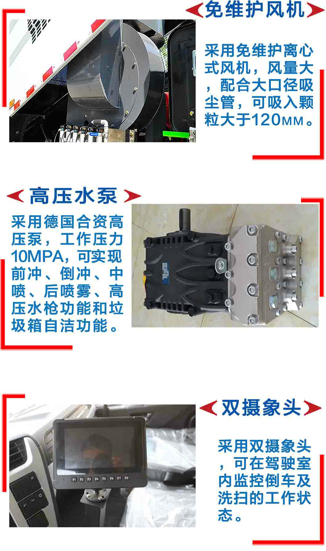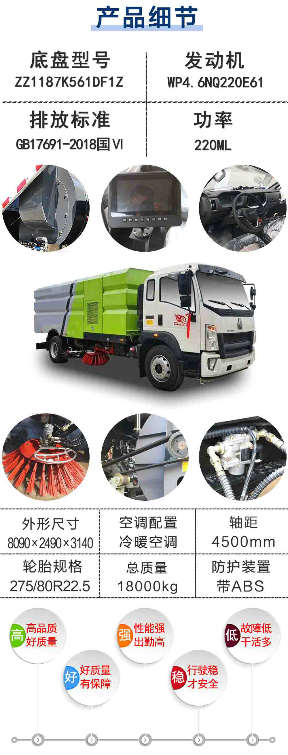 | 其他 | 此車為道路洗掃專用車輛,專用裝置為掃刷.防護裝置均采用Q235A材質(zhì),均采用焊接連接,專用裝置掃刷代替部分側(cè)面防護,掃刷離地高為(mm):180,后下部防護與車架焊接連接,后下部防護尺寸:50×150(mm),離地面高度420mm. ABS系統(tǒng)型號為XH-KQ4S4M-E01,生產(chǎn)企業(yè)為廣州市西合汽車電子裝備有限公司;型號為CM4XL-4S/4M,生產(chǎn)企業(yè)為廣州瑞立科密汽車電子股份有限公司.整車長/軸距對應(yīng)關(guān)系為(mm):7590/4200,7890/4500,8090/4700,8590/5200,8990/5600.選裝不同的外觀圖片.隨底盤選裝駕駛室. | ||