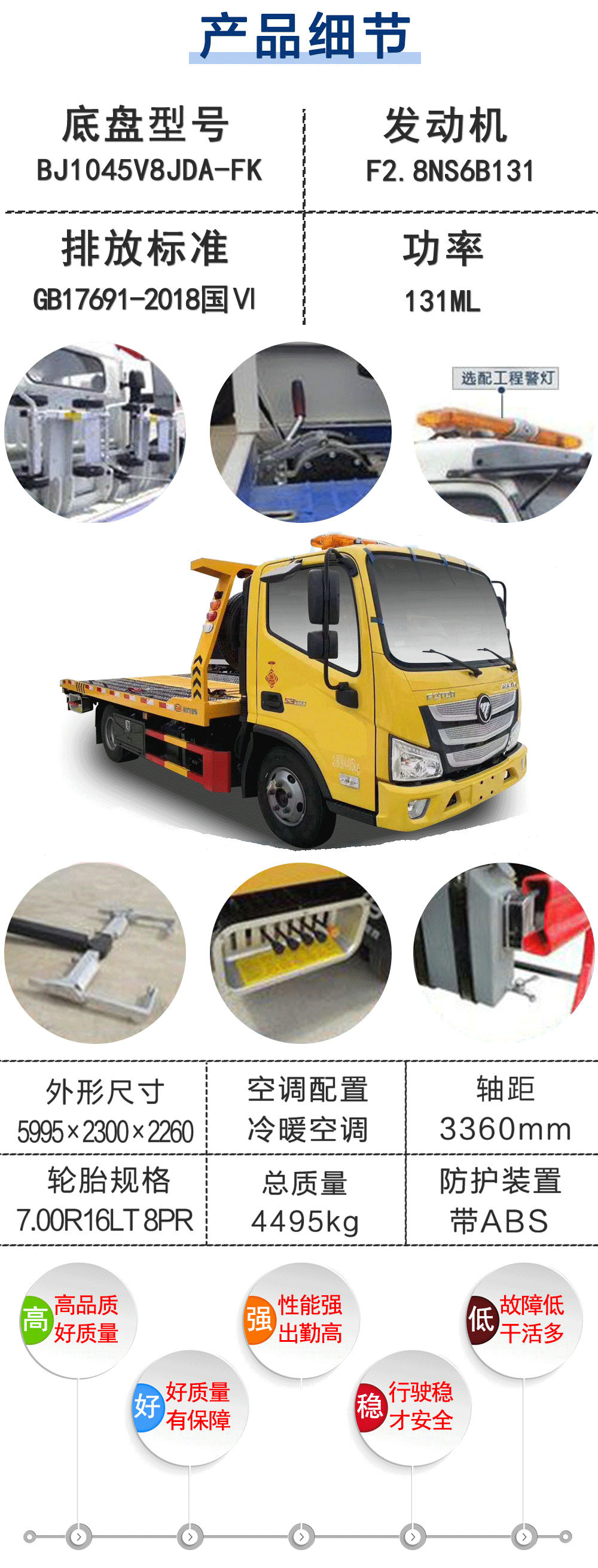 | 其他 | 1.該車主要用于道路故障車輛,城市違章車輛清理,主要專用裝置為托舉裝置,最大托舉質(zhì)量500kg;2.側(cè)后部防護(hù)材料:Q235B,連接方式:左右側(cè)面防護(hù)采用螺栓連接,后下部防護(hù)采用焊接連接,后下部防護(hù)截面尺寸100mm×40mm,離地高度420mm;3.ABS系統(tǒng)控制器型號/生產(chǎn)企業(yè):ABS-E/威伯科汽車控制系統(tǒng)(中國)有限公司,ABS-VI·E/廣州瑞立科密汽車電子股份有限公司;4.選裝全落地裝置,選裝后部結(jié)構(gòu). | ||