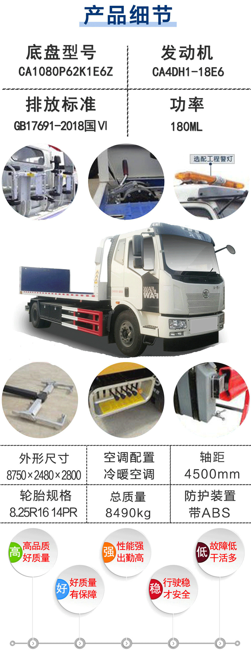 | 其他 | 此車為道路清障專用作業(yè)車.托舉質(zhì)量為:1395kg.防護(hù)材料:Q235A,連接方式:左右側(cè)面防護(hù)與副梁采用焊接連接;后部為專用專用裝置為托臂,代替后防,離地高為(mm):350;ABS防抱死制動(dòng)系統(tǒng)生產(chǎn)廠家:長(zhǎng)春瑞立科密汽車電子有限公司,型號(hào):CM4XL.隨底盤選裝駕駛室. | ||