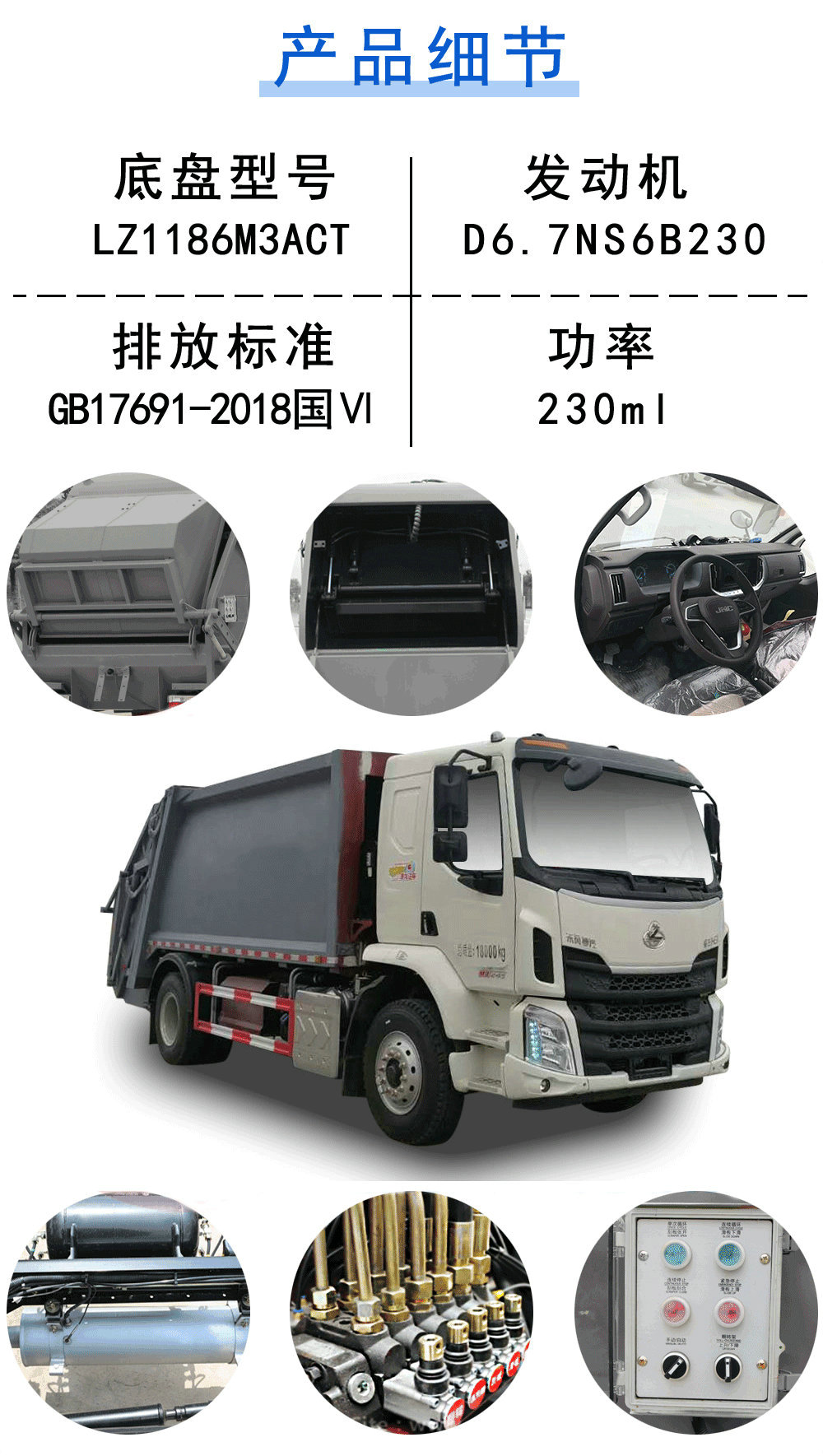| 其他 | 1、該車主要專用裝置由箱體、壓縮系統(tǒng)組成,用于垃圾的收集與清運。該車可選裝方形或弧形箱體,選裝全密封蓋裝置,選裝方形擋泥板。選裝后部工作裝置。選裝工作裝置時外形長/軸距/前懸/后伸對應(yīng)關(guān)系為(mm):8625/4500/1345/-,8725/4500/1445/-,8825/4700/1345/-,8925/4700/1445/-,8825/4500/1345/200,8925/4500/1445/200,9025/4700/1345/200,9125/4700/1445/200,9025/4500/1345/400,9125/4500/1445/400,9225/4700/1345/400,9325/4700/1445/400。僅采用4500mm,4700mm軸距。2、側(cè)防護采用冷彎型鋼/Q235,螺栓連接;后防護由專用裝置替代,下邊緣離地高:500mm。3、隨底盤選裝臥鋪側(cè)窗,選無遮陽罩,選裝導(dǎo)流罩,選翼子板,選保險杠,選前面板亮條,選A柱貼膜,選綠玻璃,選裝后處理器后置。安裝帶有衛(wèi)星定位功能的行駛記錄儀。ABS型號/生產(chǎn)企業(yè):ABS-E 4S/4M/威伯科汽車控制系統(tǒng)(中國)有限公司。采用的發(fā)動機與油耗值對應(yīng)關(guān)系為(L/100Km):YCS06245-60/26.13,D6.7NS6B230/26.25。 | ||