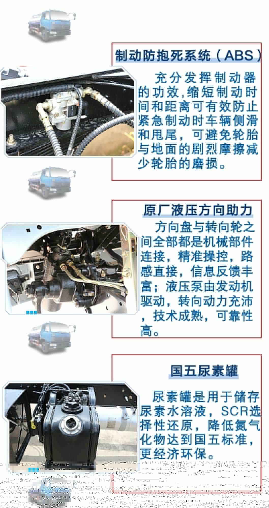 | 其他 | 1,整車長(zhǎng)度,罐體外形尺寸(長(zhǎng)×長(zhǎng)軸×短軸),軸距,前懸與后懸的對(duì)應(yīng)關(guān)系為(mm):8200/(5000×2200×1350)/4700 /1440/2060;8010/(5000×2200×1350)/4700 /1250/2060;8000/(4800×2200×1450)/4500/1440/2060;7810/(4800×2200×1450)/4500/1250/2060;7450/(4250×2300×1560)/3950/1440/2060;7260/(4250×2300×1560)/3950/1250/2060。2,側(cè)防護(hù)及后下部防護(hù)裝置均采用Q235A材質(zhì),均采用焊接連接,后下部防護(hù)尺寸:150×50(mm),離地面高度500mm。3,ABS的型號(hào): ABS-E 4S/4M,生產(chǎn)廠家: 威伯科汽車控制系統(tǒng)(中國(guó))有限公司。4,文字噴圖位置、車輛顏色及局部細(xì)節(jié)可變化。5,隨底盤選裝駕駛室。6,軸距變化引起質(zhì)量變化小于3%。7,專用裝置:罐體,主要用于抽排糞便。 | ||
