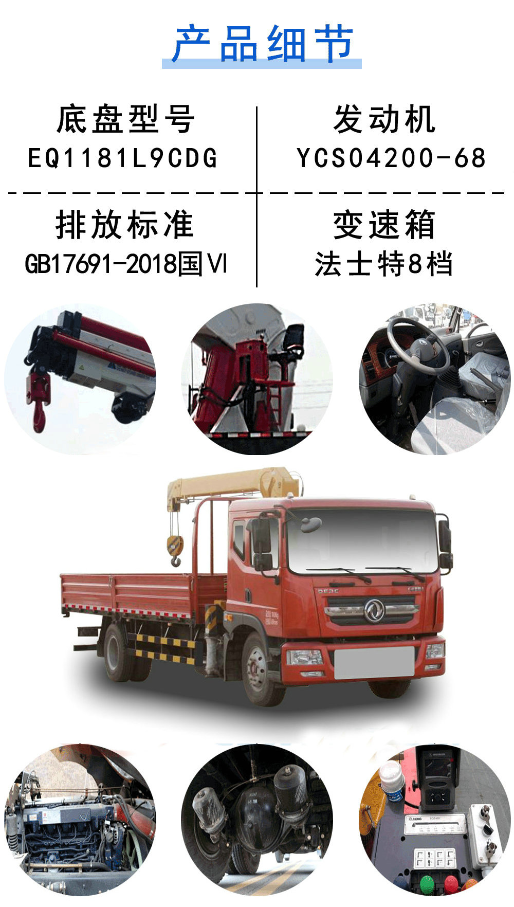 | 其他 | 隨底盤選裝遮陽罩,綠色濾光帶,踏步.選裝高頂駕駛室. 選裝鋁合金油箱.ABS系統(tǒng)生產(chǎn)廠家,型號(hào) :焦作博瑞克控制技術(shù)有限公司,J ABS;襄陽東風(fēng)隆誠(chéng)機(jī)械有限責(zé)任公司,ABS/ASR-24V-4S/4M.應(yīng)安裝具有衛(wèi)星定位功能的行駛記錄儀,側(cè)面及后下部防護(hù)裝置材料為Q235,與車架采用螺栓連接.后下部防護(hù)裝置斷面尺寸(mm):120×60,離地高度:480mm.直臂式起重機(jī)型號(hào)/最大起升載荷(kg)/吊機(jī)重量(kg)分別為: SQS200/8000/3500.選裝限速裝置時(shí)最高車速為:89km/h.YCS04200-68/B6.2NS6B230/D4.5NS6B220/CY4SK761/D4.0NS6B195/YCY30165-60/B6.2NS6B260此七款發(fā)動(dòng)機(jī)油耗值均為26.2(L/100km). | ||