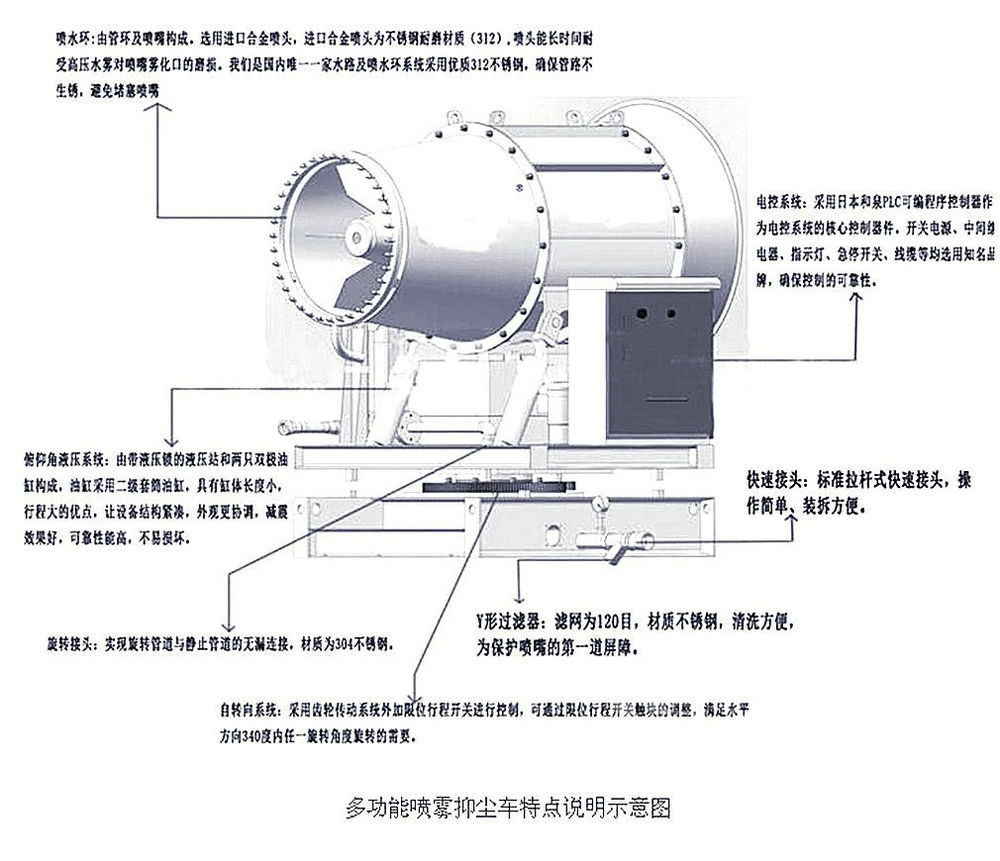-操作靈活,使用安全可靠,遙控和人工控制操作,可隨意控制調(diào)節(jié)水平選裝噴霧角度;