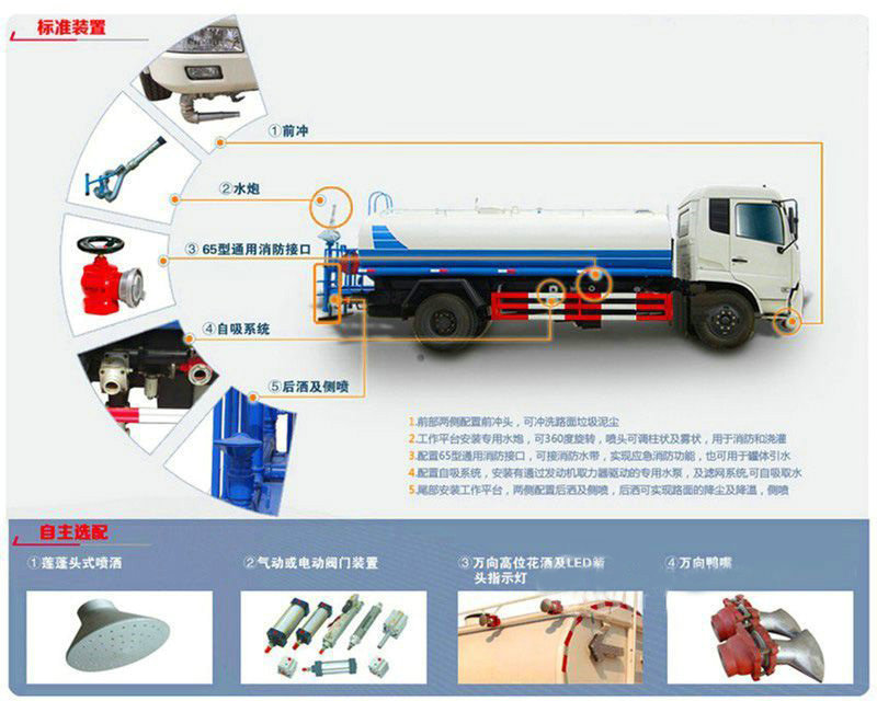 上裝配置:罐體采用4mmQ235優(yōu)質碳鋼板制作,容積12立方,前沖(噴)后灑,帶側噴,罐體后帶工作平臺,平臺上安裝綠化灑水炮,灑水炮可全方位旋轉,可連續(xù)調成直沖狀、大雨、小雨、毛毛雨,帶安全護欄,配備全國質量評比第一名的億豐大功率專用灑水泵,泵可自吸自排,安裝過濾網,帶消防接口,可通過消防栓進水,帶自流閥,罐體金屬漆。