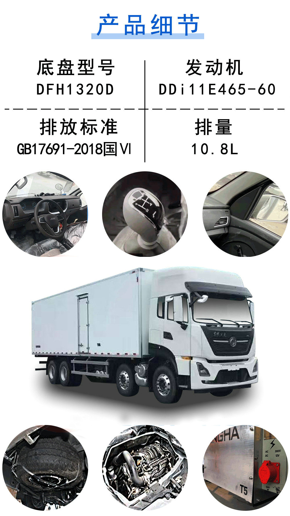 | 其他 | 隨底盤(pán)選裝僅高度不同的駕駛室,高頂駕駛室頂部氣喇叭為選裝件,駕駛室前角擾流板為選裝件,選裝單油箱或雙油箱;貨廂選裝單開(kāi)門(mén),雙開(kāi)門(mén)和不開(kāi)門(mén)型式;選裝其它廠家功率相當(dāng)?shù)闹评錂C(jī)組,選裝前置式,內(nèi)置式,底置式制冷機(jī)組;選裝升降尾板,尾板收起狀態(tài)時(shí)的水平長(zhǎng)度為295mm;廂體頂部封閉,不可開(kāi)啟;側(cè)防護(hù):材料Q235,螺栓連接;后下防護(hù):材質(zhì)Q235.螺栓連接,斷面尺寸120×60mm,離地高度460mm;安裝具有衛(wèi)星定位功能的行駛記錄儀;裝有ABS,ABS型號(hào)/生產(chǎn)廠家:ABS 8/東科克諾爾商用車(chē)制動(dòng)系統(tǒng)(十堰)有限公司;發(fā)動(dòng)機(jī)DDi11E465-60對(duì)應(yīng)油耗申報(bào)值37.1L/100km. | ||