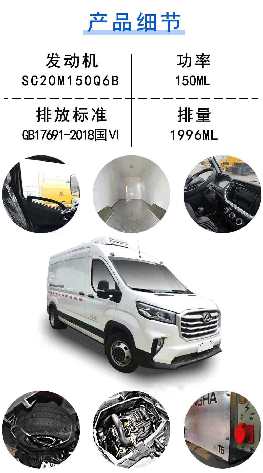 | 其他 | 1、裝備制冷機(jī)組等專用設(shè)備;2、車廂頂部封閉不可開啟,駕駛區(qū)與貨倉有效隔離,貨廂部位無車窗;該車選裝高頂(高度為2965mm),整車高度對應(yīng)內(nèi)廂高度為:2745/1580、2965/1800;3、可選裝電動側(cè)踏步、前格柵、LED前組合燈、LED后尾燈、日間行車燈、輪圈、輪飾蓋、后尾標(biāo)、前霧燈、后攝像頭;4、ABS型號:ABS 9,ESP9.ABS生產(chǎn)企業(yè):博世汽車部件(蘇州)有限公司,博世汽車部件(蘇州)有限公司.5、發(fā)動機(jī)型號SC20M150Q6B,最大凈功率108.5kW,對應(yīng)油耗值為9.8L/100km,發(fā)動機(jī)型號SC20M150Q6,最大凈功率108.5kW,對應(yīng)油耗值為9.8L/100km. | ||